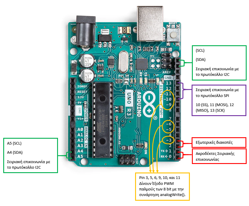 - PWM: 3, 5, 6, 9, 10, και 11 pins. Παρέχουν Έξοδο 8-bit PWM με την συνάρτηση analogWrite().