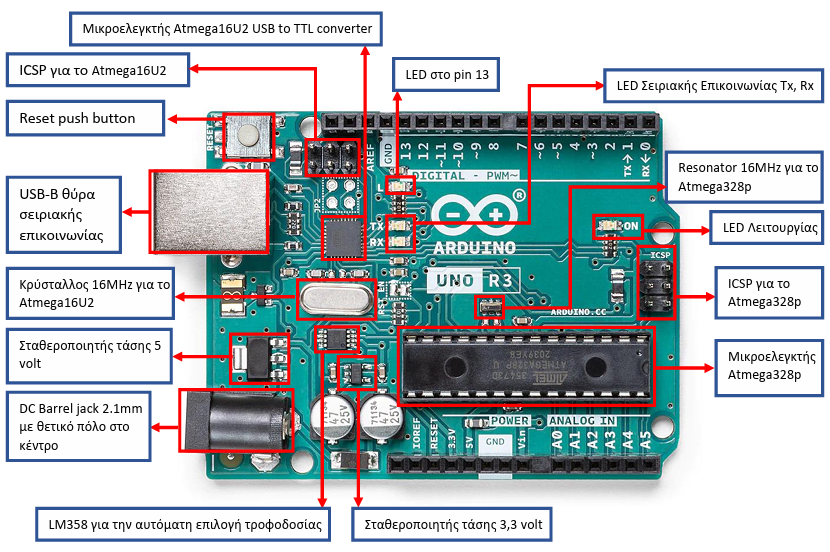 - LED 13: Στον ακροδέκτη 13 υπάρχει ένα ενσωματωμένο LED. Όταν ο ακροδέκτης έχει τιμή HIGH, το LED ανάβει ενώ όταν το pin είναι LOW δεν ανάβει.